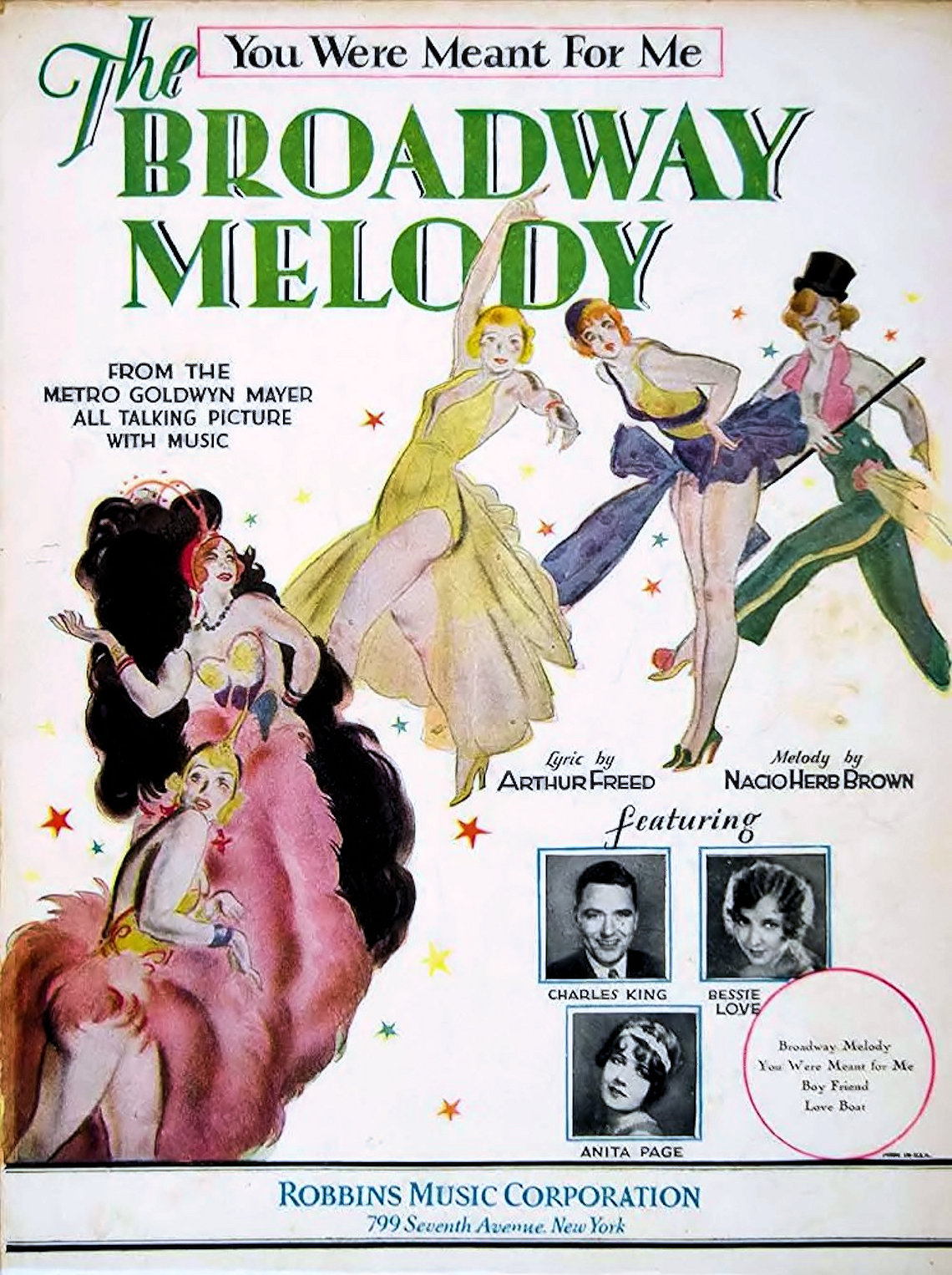 The Broadway Melody was written by Norman Houston and James Gleason from a story by Edmund Goulding, and directed by Harry Beaumont. Original music was written by Arthur Freed and Nacio Herb Brown, including the popular hit "You Were Meant For Me". The George M. Cohan classic "Give My Regards To Broadway" is used under the opening establishing shots of New York City, its film debut. Bessie Love was nominated for an Academy Award for Best Actress for her performance.